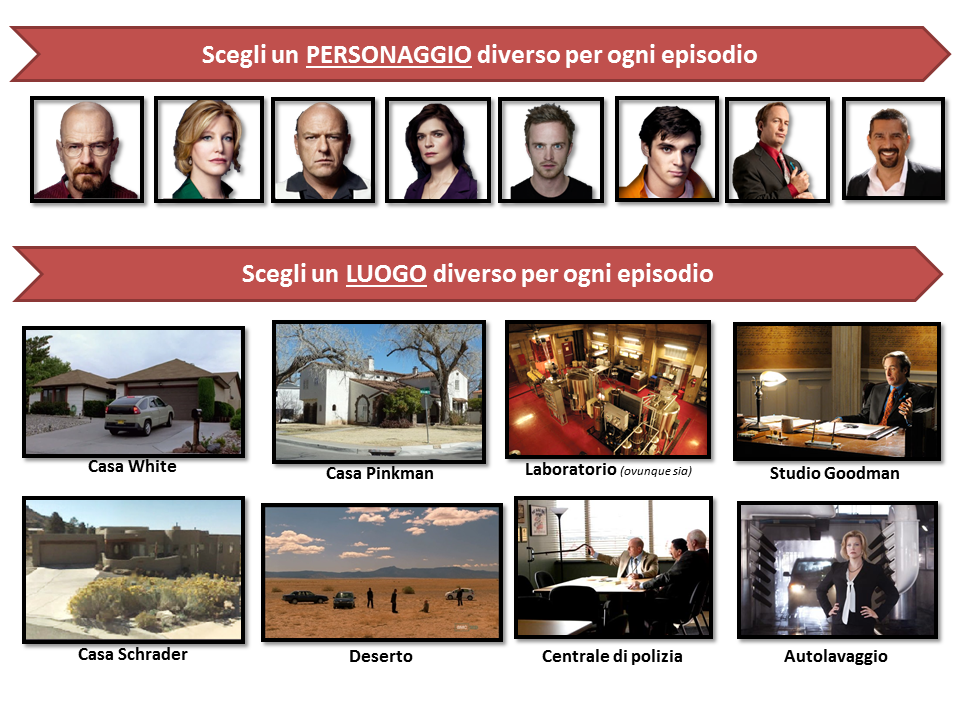 8 episodi, 8 personaggi, 8 luoghi. Per ogni episodio scegliete un personaggio e un luogo da schierare sempre diverso, cercando di ottenere più punti possibili.