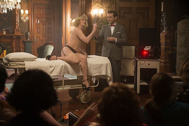 Altro protagonista della serie è senza dubbio il sex del titolo. Con queste due puntate cominciamo a vederne finalmente una rappresentazione più problematica, a differenza di un pilot da questo punto di vista deludente. In Race to Space è la sfera privata ad essere protagonista, attraverso le (dis)avventure sessuali di Haas – divertenti e funzionali alla creazione del contesto in cui si muovono i personaggi – e quelle di Libby e Bill, mentre nel terzo episodio assistiamo al progredire della ricerca grazie ai contributi di prostitute e prostituti, con tutto ciò che ne consegue. Innanzitutto il fatto che il materiale per la ricerca venga fornito da chi con il sesso ci lavora, rende più comprensibile la quasi totale assenza di imbarazzo che nel pilot, da parte delle prime cavie, ci aveva lasciato perplessi (basti pensare che nella realtà i soggetti di Masters si servivano di buste di plastica per coprirsi il volto, mentre nella serie l’incontro tra i due anonymous si svolge in maniera del tutto naturale). Certo, le sequenze che vedono le prostitute alle prese con la propria sessualità sono un po’ scontate, ma almeno risultano decisamente più credibili. Interessante è la questione dell’omossessualità e il modo in cui vi si rapporta Masters, forse meno open-minded di quanto egli stesso si consideri. Ancora una volta è proprio questo personaggio a conferire spessore allo show, a differenza di certi comprimari (come il quasi sempre insopportabile Haas) e di storyline potenzialmente interessanti ma purtroppo maltrattate (il matrimonio di Betty su tutte).
