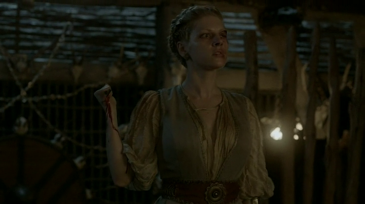 Entrambe animate da coraggio e determinazione, si distinguono senz’altro tra di loro per i mezzi utilizzati per perseguire i propri scopi. Siggy, infatti, non esita a tralasciare per un attimo la sua dignità di “donna libera” pur di cementare un’alleanza con Re Horik, di cui ancora non si prevedono conseguenze nell’immediato. Viceversa, troviamo una Lagertha che non intende subire ulteriori umiliazioni dall'”adorato” consorte e che, gettando al vento ogni buon proposito diplomatico, si riprende la sua libertà compiendo un gesto violento, istintivo, cruento, eppure condivisibile. Trattasi di un gesto di rivalsa e di conclusione di un segmento narrativo che non aveva avuto molto pathos sul piano del racconto, se non quello di sottolineare l’impeto furente di uno dei ritratti umani, a mio avviso, più riusciti dello show.