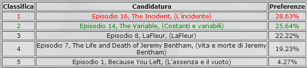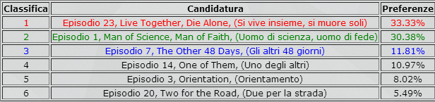Nel primo girone a dominare è stato ancora una volta l’episodio da cui tutto è iniziato, il Pilot, con circa un terzo dei voti a suo favore, seguito dal finale di stagione Exodus. Deus Ex Machina ha la meglio, di poco, su Numbers, e conquista l’accesso alla fase successiva. Esclusi anche The Moth e Walkabout.
