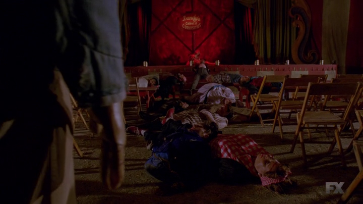 La messa in scena dell’horror merita un discorso a parte: se nella prima stagione era la casa ad essere violata (e quindi la famiglia e l’intimità per assonanza) e nella seconda la mente umana (non a caso era ambientata in un manicomio), in Freak Show si è preferito parlare di qualcosa di meno metaforico, sottolineando quanto gli uomini siano tutti freak, al di là di qualsiasi distinzione fisica, mentale o sociale. Anche la parte horror è stata meno figurata rispetto al passato, prendendo quasi esclusivamente la forma dell’omicidio. L’esperienza della morte come momento catartico e purificatore viene però inibita dalla poca attenzione riservata alle uccisioni, che si inseguono senza essere valorizzate sia narrativamente che esteticamente. La mattanza del finale, che vorrebbe essere un’imitazione sbiadita e inefficace delle stragi di tipo scolastico alla Gus Van Sant, ricorda molto un altro tentativo simile di Murphy in Glee, anch’esso poco coinvolgente. La mancanza di pathos e della crudeltà estrema che accompagna il gesto finisce per renderlo inutile narrativamente ed emozionalmente, e quindi evitabile.