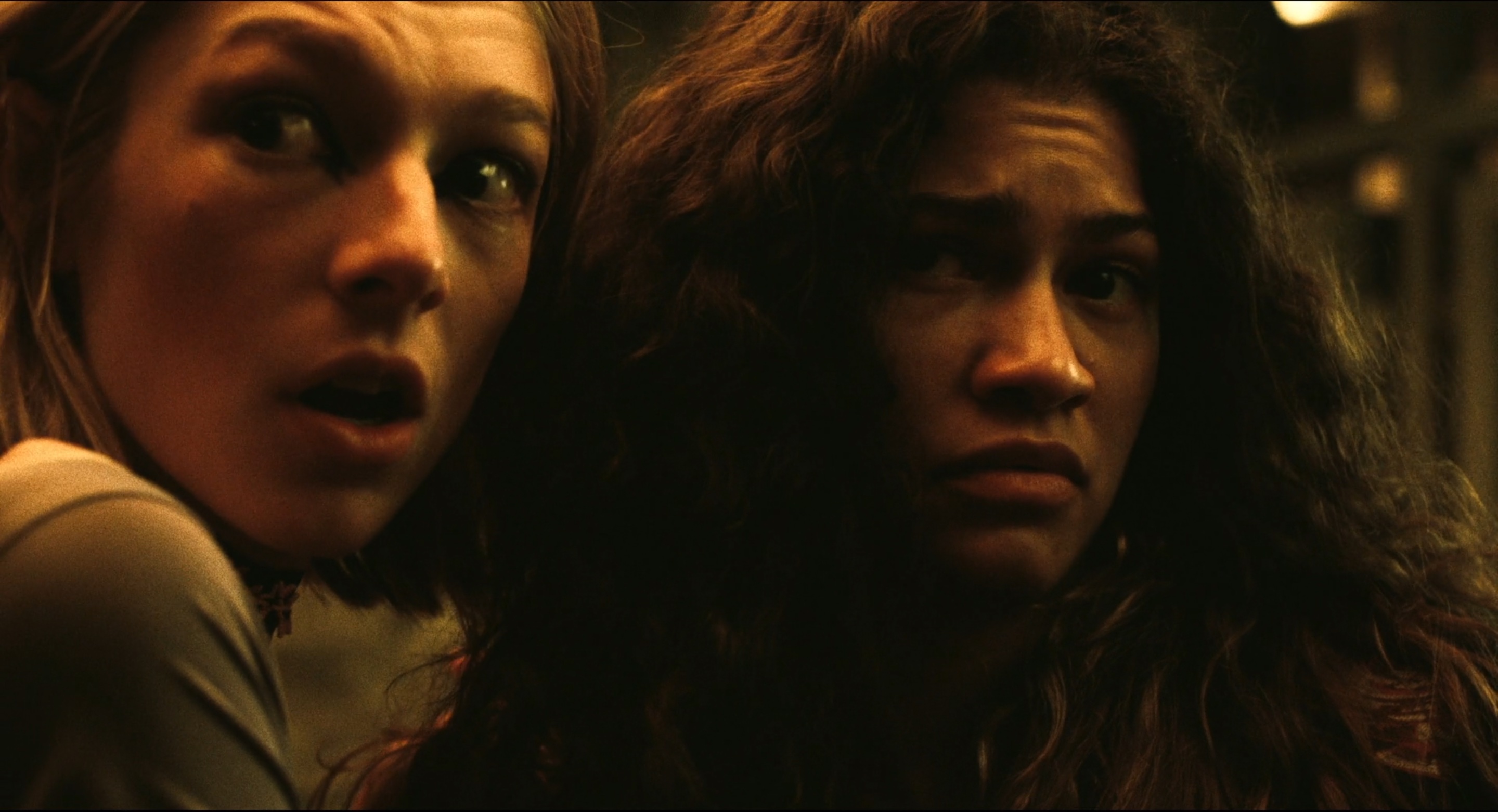 Nel corso dei festeggiamenti i personaggi si interfacciano tra loro in modo nuovo, e questa è un’altra cosa inedita. Cassie e Nate si rintanano in bagno nel tentativo di fare sesso ma vengono interrotti da Maddie, a cui segue la lunga attesa della prima di poter uscire senza farsi scoprire stesa nella vasca da bagno, dove la sua precaria stabilità emotiva viene messa a dura prova. E la telecamera alla Hitchcock-maniera che riprende la stanza dall’alto ci fa sentire tutta la tensione di Cassie e ci fa temere davvero per quello che le sarebbe potuto accadere se l’amica l’avesse scoperta lì. Poi ci sono Lexi e Fez, che si trovano a parlare per la prima volta e, immersi nel delirio che li circonda, sembrano i personaggi più pacati e sper i quali è impossibile non iniziare a tifare; entrambi legati da una lunga storia di affetto per Rue, potrebbero essere davvero una lieve ventata di “relazione sana” all’interno di questa grande centrifuga. Kat e Jules continuano la loro amicizia festaiola, e infine Rue ci introduce un nuovo personaggio, Elliot (Dominic Fike). Ma è con l’ennesima e profonda discesa di Rue nella sua dipendenza che la festa inizia ad avere la forza di un vortice, in cui ci sono due punti centrali: il primo è rappresentato dall’incontro tra Rue e Jules davanti al falò, in cui la luce inizia ad essere naturalmente intermittente, escludendo completamente il mondo al di fuori di loro e lasciandole al centro della scena. Il tempo rallenta, la musica ha un’eco quasi sacrale e mentre le due ragazze si ritrovano con un bacio e una semplice confessione, veniamo immersi in alcuni minuti da vero e proprio videoclip, in cui la luce extra-diegetica si accende e si spegne illuminando tutti i personaggi, uno dopo l’altro, provandone a coglierne l’essenza, o comunque nel tentativo di catturare in quale preciso istante emotivo si trovano – come fossero dei dipinti. E mentre il tempo sembra scivolare, arriva il secondo punto centrale di questo secondo atto: Fez, dopo aver chiesto il numero a Lexi, pesta a sangue Nate senza esclusione di colpi, in un moto di giustizia fai-da-te, per Rue e per Jules.